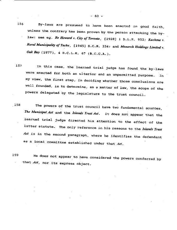 Dorgan J Pastula versus Islands Trust By taking the zoning power from the Capital Regional District and giving it to the Trust the legislative has indicated its faith that the trustees are in the best position to obtain the broad object set out in S3 of the Act. The court should be especially cautious about second guessing the Trust merely because the Trust has exercised its zoning powers in a way different than the court, or the Capital Regional District, might have done. 1991 |