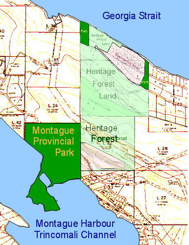 ![]() By happy coincidence this east-west strip of Heritage Forest land overlaps with Montague Provincial Park so that there is a protected forest corridor stretching from the Georgia Strait to Trincomali Channel. Such green corridors are recognized as being highly beneficial to wildlife and biodiversity. |